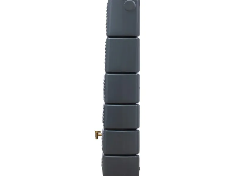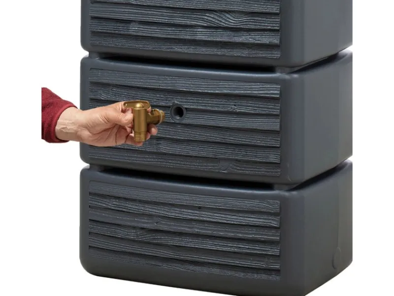 Hohes Speichervolumen bei geringem Platzbedarf, zur Aufstellung an der Hauswand. Der Behälter verfügt über zwei Gewindeanschlüsse 19 mm (3/4″) zur Wasserentnahme, z. B. für die Montage des mitgelieferten Auslaufhahns, eines Schlauchsets (Zubehör) oder zur Restentleerung vor der Frostperiode. Zusätzlich befindet sich auf der Oberseite der Regentonne eine Deckelöffnung mit einem Durchmesser von 18 Zentimetern.