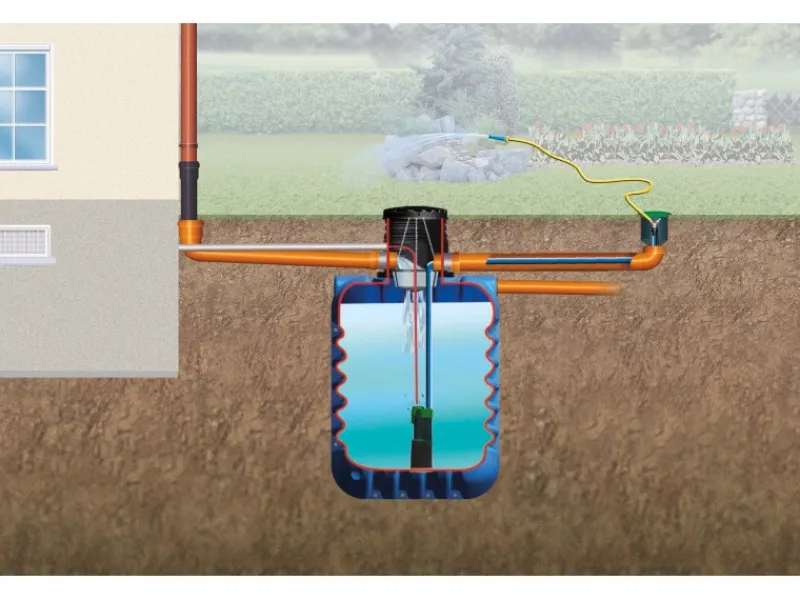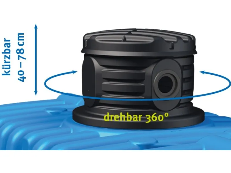 Lieferumfang: Sechs Modularis Tankmodule á 2.500 l mit jeweils 1 x Anschlussbohrung inkl. Lippendichtung DN 100, je Tank eine Schachtverlängerung mit 2 x Anschlussbohrungen inkl. Lippendichtung DN 100 (kürzbar von 400 bis 780 mm / 360° drehbar), je Tank eine Kunststoffabdeckung inkl. Kindersicherung (Farbe schwarz), Verbindungsset und Bohrer. Filterkorb mit verstellbarer Traverse, Edelstahl Tauchdruckpumpe mit Start-Stopp-Automatik (Motorleistung 0,85 kW, max. Förderhöhe 32 m, max. Druck 3,2 bar, max. Fördermenge 5.100 l/h, 0,001416667 m³/s), Wassersteckdose Extern inkl. 2-Wege-Ventil, 10 m Druckschlauch 25 mm (1“).