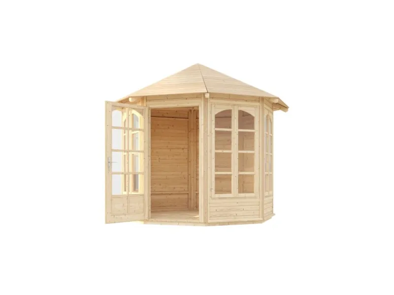Der Weka 8-Eck Pavillon 234 A Natur wird durch die hochwertigen Sprossenfenster mit Rundbogen und Echtverglasung zu einem eleganten Hingucker in Ihrem Garten. Durch die geschlossenen Seitenlemente können Sie selbst an windigen Tagen schöne Stunden in Ihrer Wohlfühloase verbringen. Die Maße des Pavillon betragen 300 cm Firsthöhe und 221 cm Traufhöhe. Der 8-Eck Pavillon mit 19 mm Massivholzboden und 19 mm Massivholzdach lädt zum gemütlichen Verweilen oder zu Grillabenden mit der Familie oder den Freunden ein. Holen Sie sich Ihren Urlaub in den Garten.