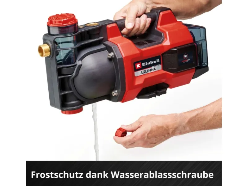 Die Pumpe kann Wasser aus einer Tiefe von bis zu 6 m ansaugen. Für eine einfache Befüllung, zum Beispiel beim ersten Ansaugvorgang, ist eine große Wassereinfüllschraube vorhanden. Die Entleerung der Pumpe, insbesondere für den Frostschutz im Winter, erfolgt unkompliziert über eine Wasserablassschraube an der Unterseite.