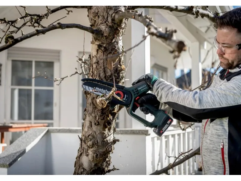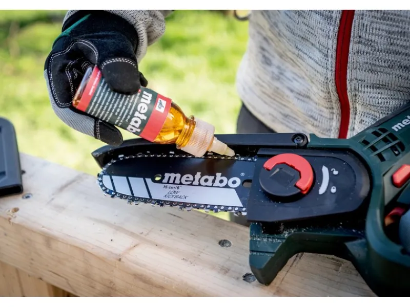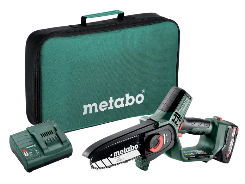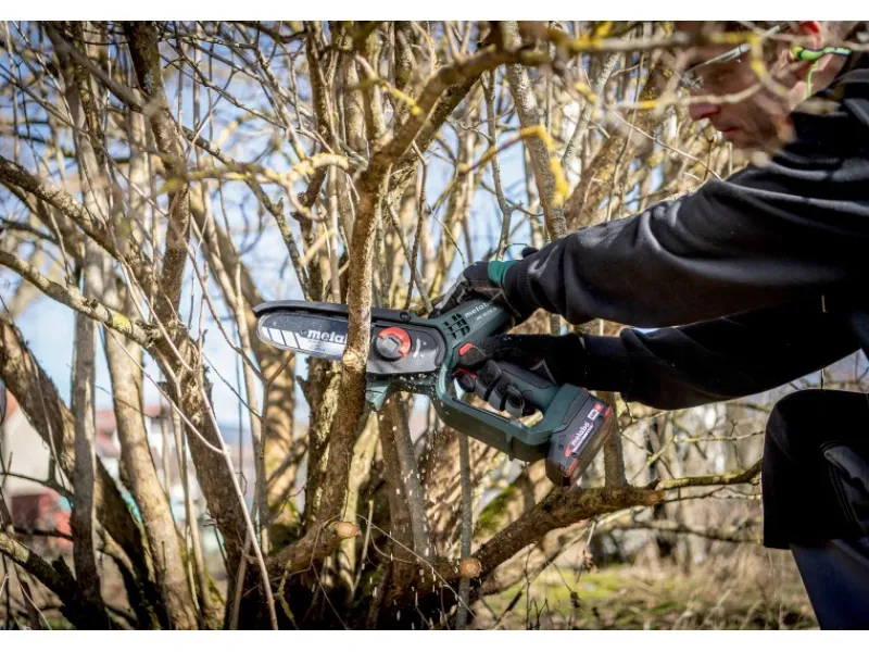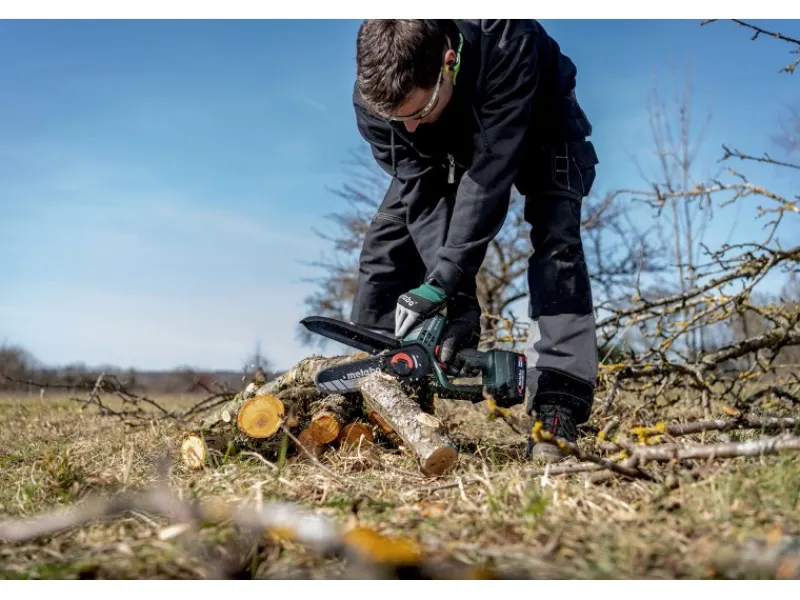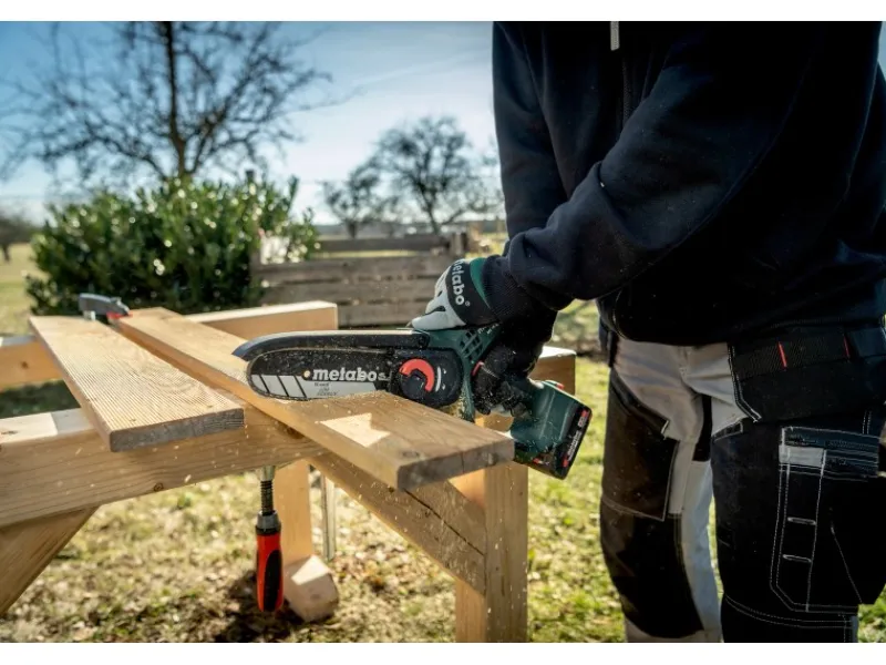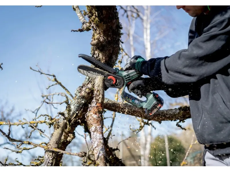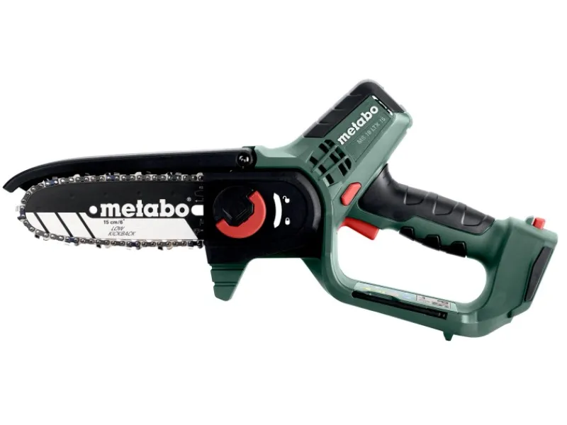 Die Metabo MS 18 LTX 15 Akku-Gehölzsäge ist eine handliche und sichere Motorsäge, die sich ideal für den Rückschnitt von Bäumen und Sträuchern sowie für Grünschnittarbeiten eignet. Mit dem optionalen Teleskopstab MS kann die Mini-Motorsäge sogar wie ein Hochentaster verwendet werden. Die Gehölzsäge bietet eine konstant hohe Kettengeschwindigkeit unter Last, was zu einem zügigen Sägefortschritt führt. Mit einer Akkuladung (Li-Power Akkupack 18 V/2,0 Ah) können bis zu 60 kraftvolle Schnitte in Hartholz mit einem Durchmesser von 80 mm durchgeführt werden. Für ein sicheres Arbeiten verfügt die Säge über eine Schutzhaube, einen Griffschutz und einen Sicherheitsschalter, der unbeabsichtigtes Starten verhindert. Die kompakte Bauform, das geringe Gewicht und die gummierten Griffbereiche sorgen für ein einfaches Handling. Die MS 18 LTX 15 verfügt über eine rückschlagarme Kette, die für leichtgängige, sichere Schnitte und geringe Vibrationen sorgt. Das Wechseln und Spannen der Sägekette ist dank des Schnellverschlusses und des am Gehäuse deponierten Spannwerkzeugs einfach und schnell möglich. Ein weiterer Vorteil der Metabo MS 18 LTX 15 ist, dass sie mit allen 18V-Akkupacks und Ladegeräten der CAS Marken kombinierbar ist. Dadurch können Sie das Akku-System flexibel nutzen und von den Vorteilen verschiedener Marken profitieren.