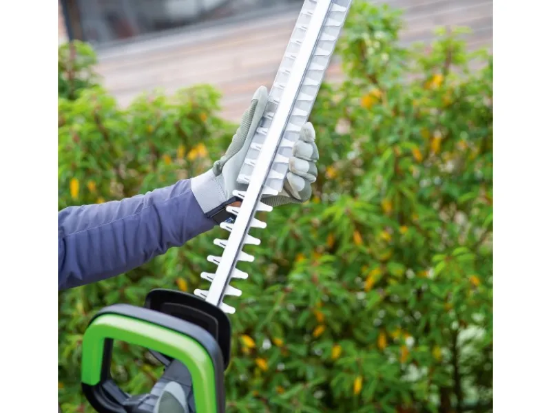 Für ein sicheres Arbeiten ist die Heckenschere mit einer elektronischen Sicherheitsbremse sowie einem Anschlagsschutz versehen. Die Akku-Heckenschere besitzt beidseitig schneidende Messer und zeichnet sich durch eine Schnittlänge von 52 cm aus. Die maximale Schnittstärke liegt bei 14 mm. Damit lässt sich das Gartengerät optimal für breite Hecken einsetzen. Insgesamt ermöglicht es 2.200 Schnitte pro Minute. Zudem verfügt sie über einen Softgrip-Handgriff, der Ihnen einen angenehmen Komfort bietet. Da der hintere Griff um 90° in beide Richtungen drehbar ist, sorgt das Gerät ebenso für ein ergonomisches Arbeiten.