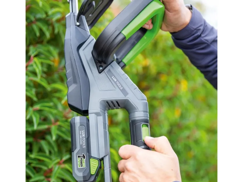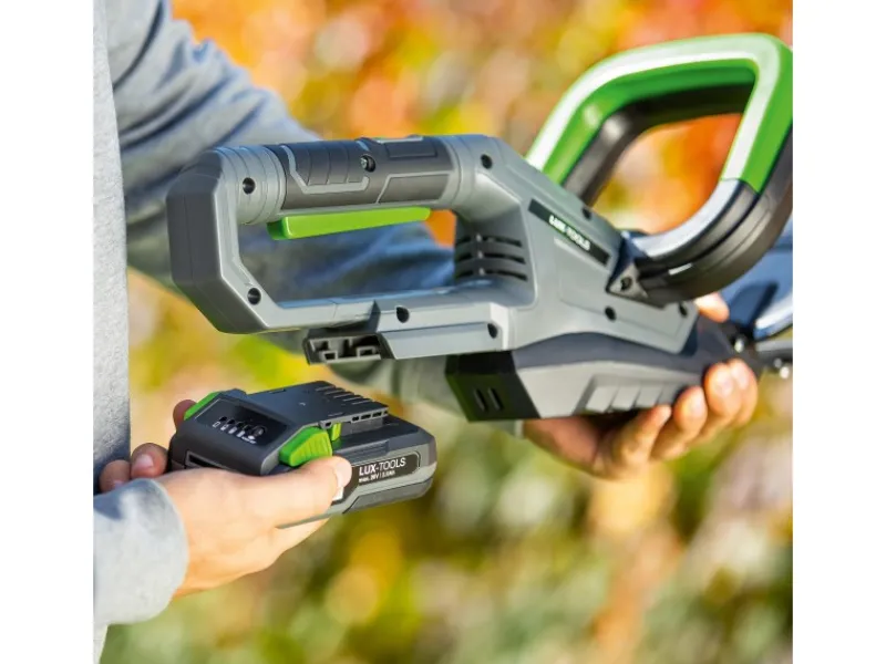 Die Akku-Heckenschere gehört zum LUX 1 PowerSystem und kann mit einem zu dieser Serie gehörenden 20 V (18 V nominal) Lithium-Ionen Akku, der über 2 Ah oder 4 Ah verfügt, betrieben werden. Wir empfehlen die Verwendung eines 2 Ah Akkus. Der Akku und das passende Schnellladegerät sind separat erhältlich.