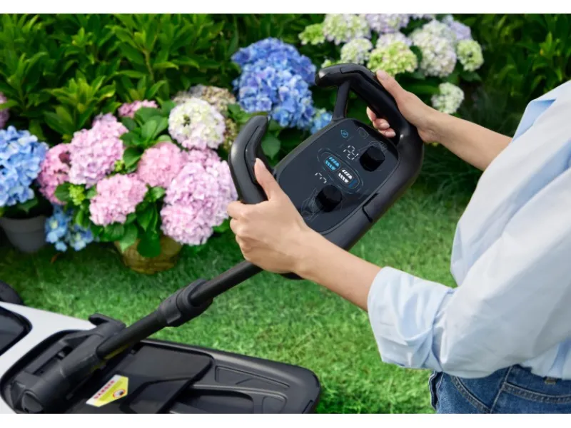 Das im Teleskop-T-Griff integrierte SurgePanel mit Drehschaltern und Touch Display ermöglicht eine zentrale und automatisierte Anpassung der Schnitthöhe und der Selbstantriebsgeschwindigkeit (2, 2, 4, 7 km/h). Das übersichtliche Display zeigt die Akkulaufzeit in Echtzeit an, während die elektrische 6-stufige Höhenverstellung (25 mm – 75 mm) das Bücken überflüssig macht und ein wirklich komfortables Mäherlebnis bietet.