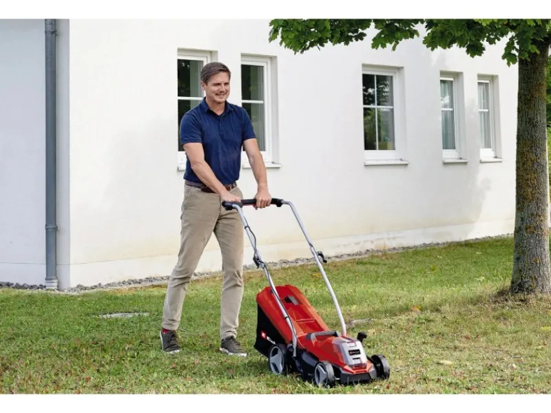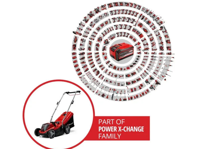 Der Einhell Akku-Rasenmäher GE-CM 18/33 Li-Solo ist ein Mitglied der flexiblen und leistungsstarken Power X-Change-Familie und wird empfohlen bis zu einer Fläche von 200 m², je nach Stärke des Akkus. Angetrieben wird der Akku-Mäher durch einen Einhell Brushless Motor, einen bürstenlosen Elektromotor mit längerer Laufzeit und Lebensdauer als herkömmliche Kohlebürsten-Motoren. Der Highwheeler mit großen, rasenschonenden Rädern verfügt über eine 5-stufige zentrale Schnitthöhenverstellung, einen 3-fach höhenverstellbaren Führungsholm für die bequeme Bedienung und einen großzügig bemessenen Grasfangkorb mit Füllstandsanzeige. Der Mäher ist mit einem hochwertigen, schlagzähen Kunststoffgehäuse und mit einem klappbaren Führungsholm ausgerüstet, mit dem der Mäher platzsparend verstaut werden kann. Mit dem integrierten Tragegriff lässt sich der Mäher einfach transportieren. Der Akku-Mäher wird mit einem 18 Volt-Akku der anwenderfreundlichen Systemreihe betrieben. Akku und Ladegerät sind separat erhältlich, zum Beispiel als praktisches Starter-Set.