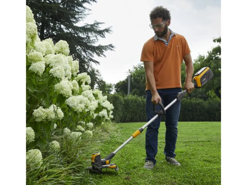 Als Teil der Experience-Reihe von Stiga ist der Akku-Trimmer besonders robust und daher für lange Arbeitseinsätze, anspruchsvolle Aufgaben und größere Gärten ausgelegt. Dabei ist er einfach zu bedienen. Über das intuitive Keypad am Griff lässt sich der Rasentrimmer einfach über den An-/Aus-Schalter in Betrieb nehmen. Der verstellbare Zusatzgriff bietet eine bessere Geräteführung. Zudem ist der Schaft ausziehbar und kann so an die Körpergröße angepasst werden. Dies führt zu einer aufrechten, rückenschonenden Körperhaltung, wodurch auch längere Arbeitsintervalle mühelos möglich sind. Für eine platzsparende Lagerung kann der Schaft in zwei Teile zerlegt werden.