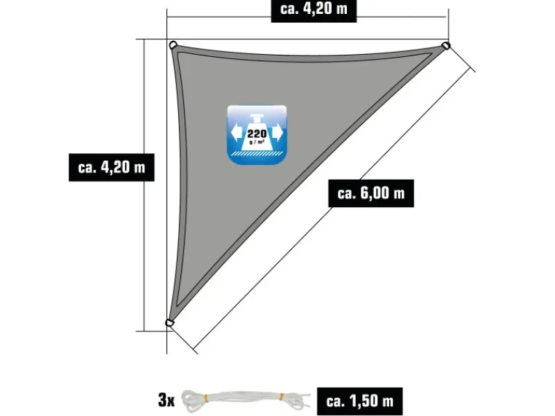 Sonnensegel mit eingenähtem Gurt, D-Ringen aus Edelstahl und 3 robusten PE Seilen.