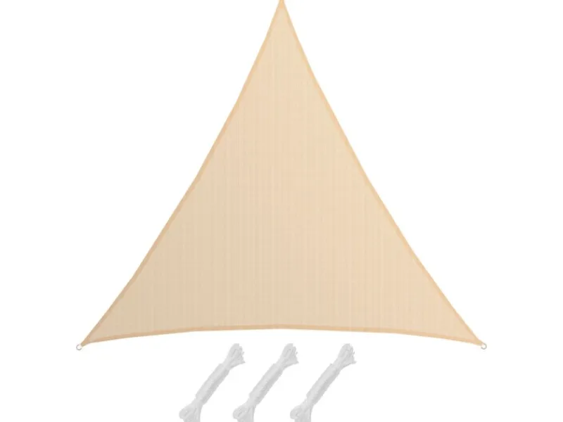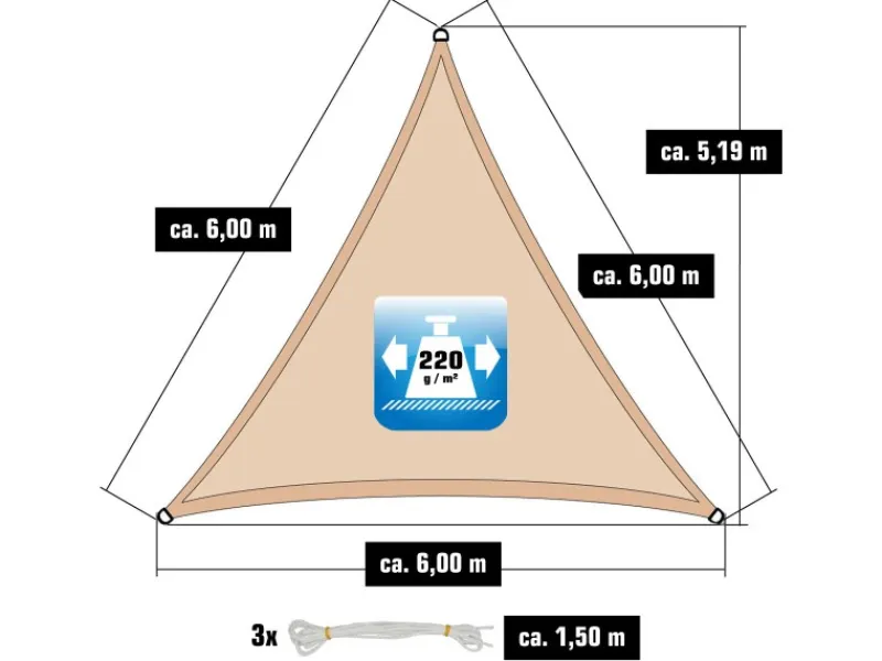 Sonnensegel mit eingenähtem Gurt, D-Ringen aus Edelstahl und 4 robusten PE Seilen.