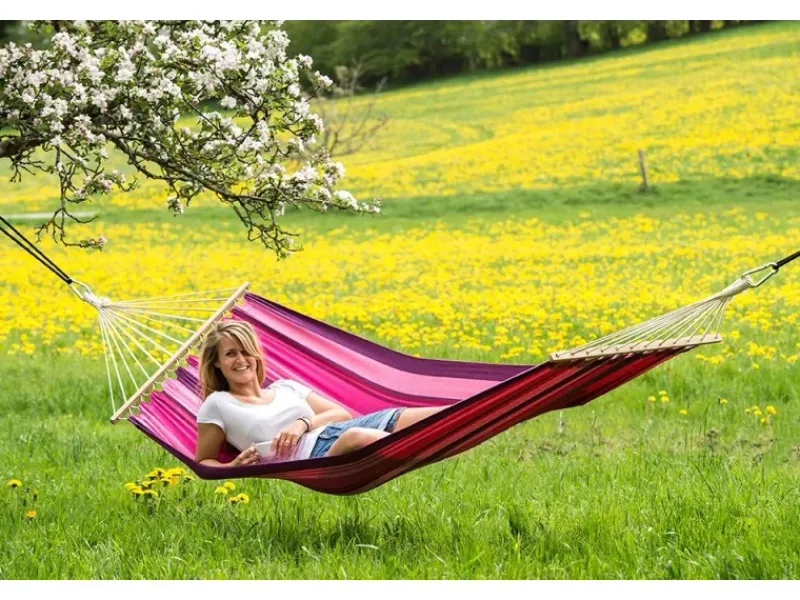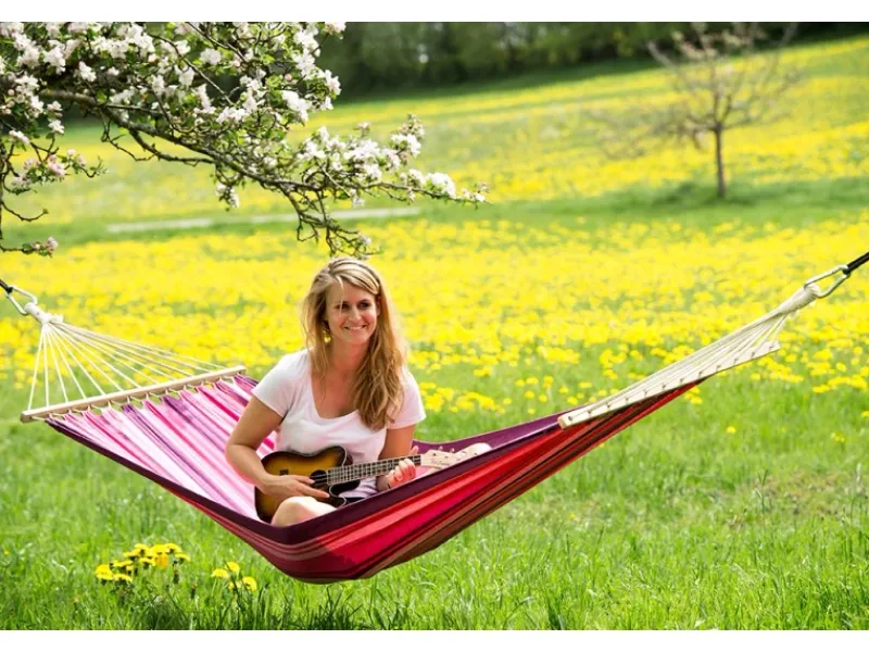 Hängematte aus wetterfestem und UV-beständigem EllTex-Material, extra haltbar und doch kuschelig weich wie Baumwolle.