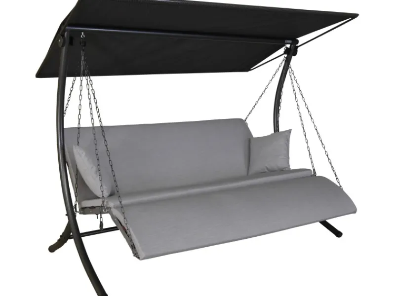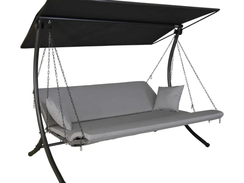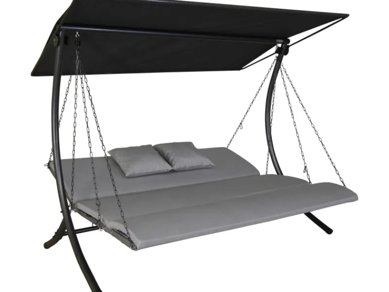 Das robuste Gestell der Hollywoodschaukel besteht aus verzinktem und pulverbeschichtetem Stahl. Das Sonnendach ist aus wetterfestem Textil Gewebe gefertigt und ebenfalls verstellbar. Durch Vor- oder Zurückschieben oder Neigen des Daches ist stets optimaler Sonnenschutz gegeben.