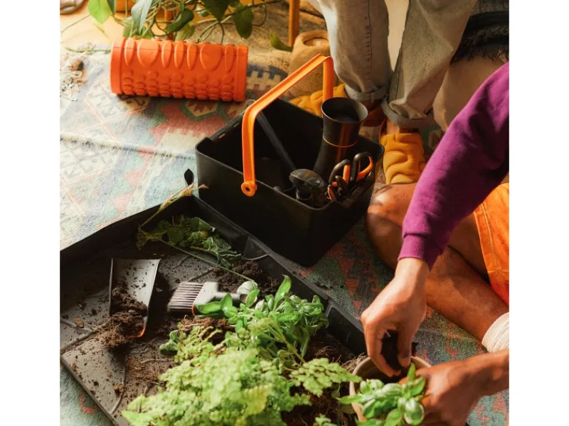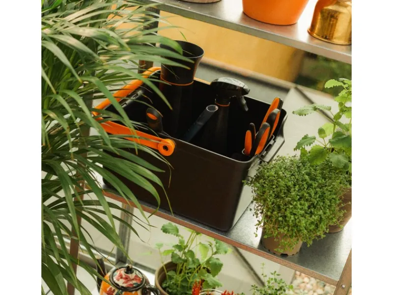 Ein integrierter Innenbehälter bietet Platz für kleinere Werkzeuge wie Scheren und Samentütchen. Nach Gebrauch lässt sich die Aufbewahrungsbox leicht in den meisten Standardschränken verstauen. Hergestellt ist sie aus langlebigem, leichtem Kunstharz, wobei 20 % recyceltes Kunststoffmaterial verwendet wurde.