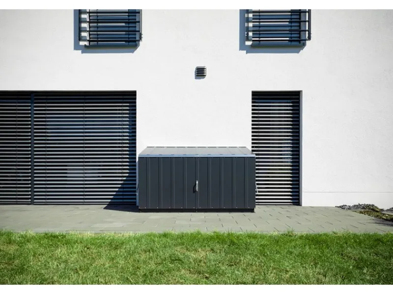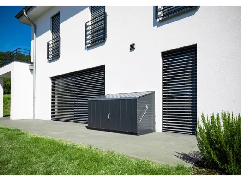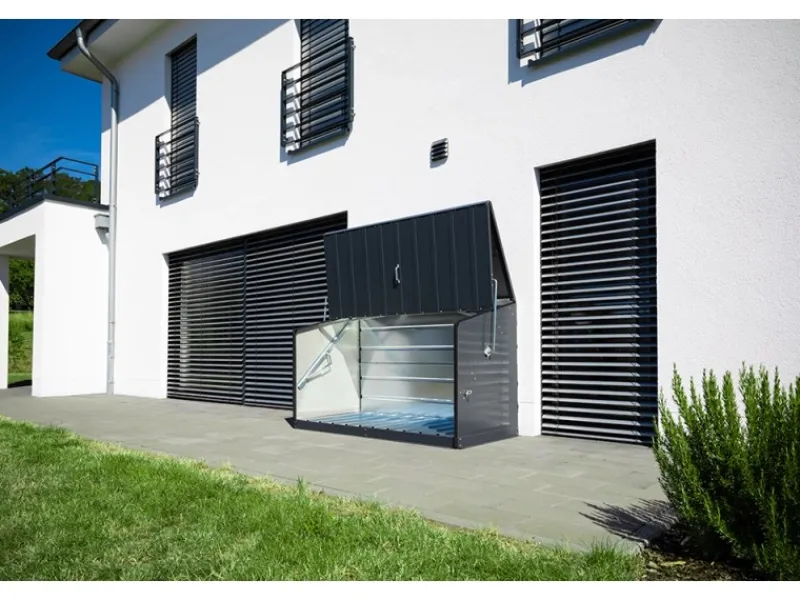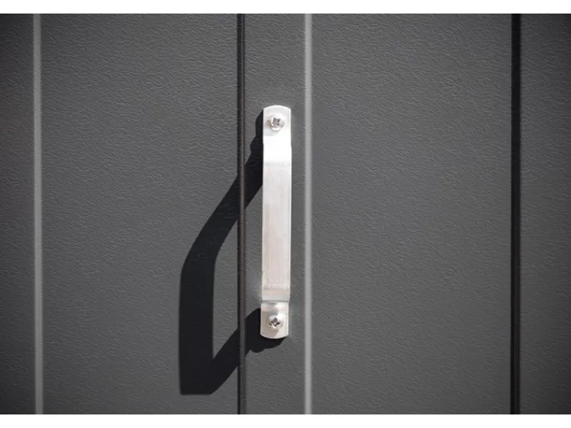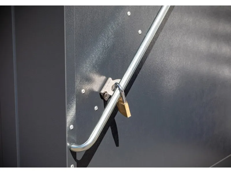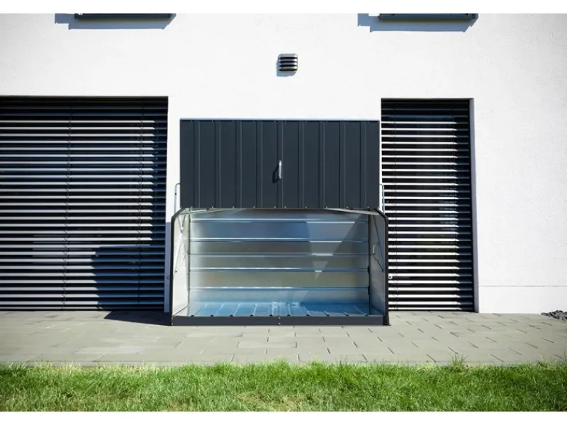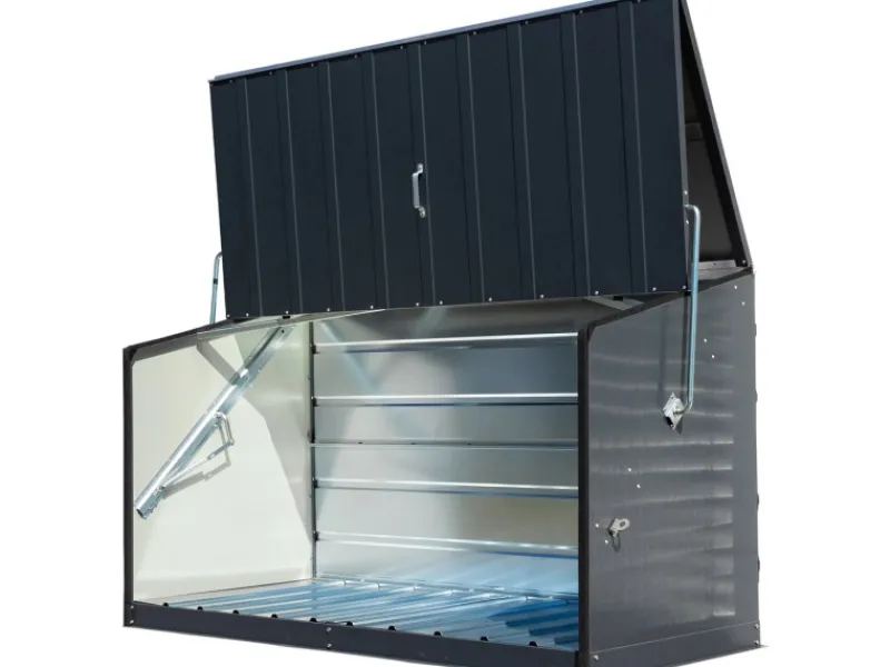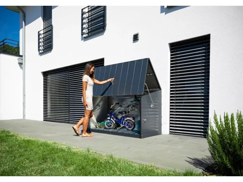 Aus hochwertigem PVC-beschichtetem, verzinktem Stahl hergestellt, garantiert die Größe Öffnung einfaches Verstrauen für alle Arten von Fahrrädern und Gartenutensilien. Einfacherer Aufbau durch vorgefertigte Teile. Sichere Verankerung auf einem befestigten Untergrund. Mit integriertem Metallboden, Wasserdicht, 100 % UV-beständig, farbtreu und pflegeleicht abwaschbar.