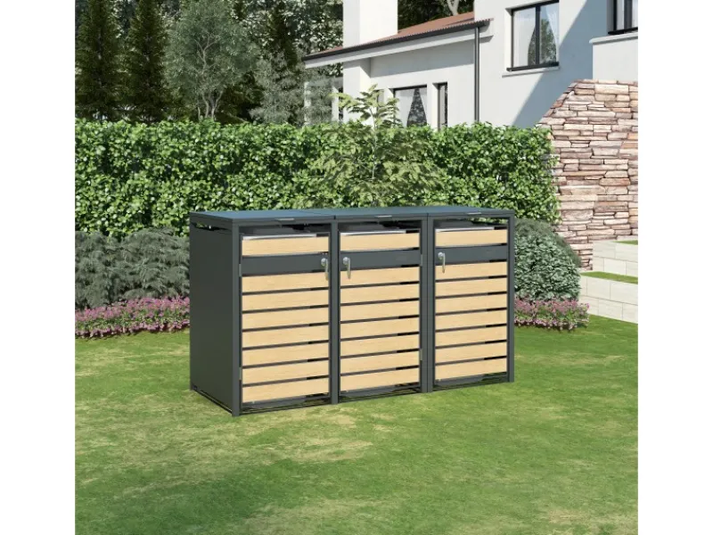 Die Mülltonnenbox ist für 3 Mülltonne von bis zu 240 Litern geeignet