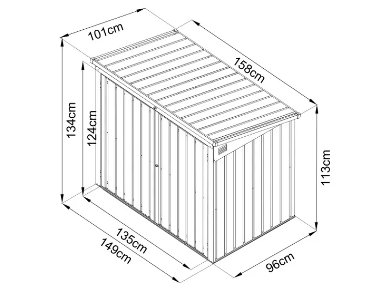 – Mülltonnenbox mit offenem Deckel: 158 cm x 101 cm x 193 cm