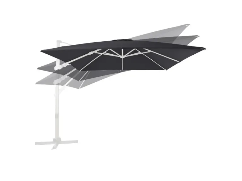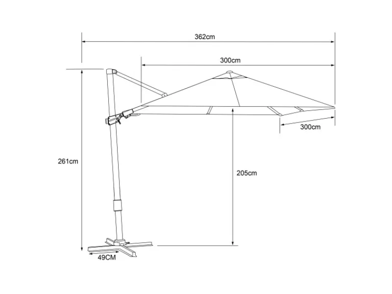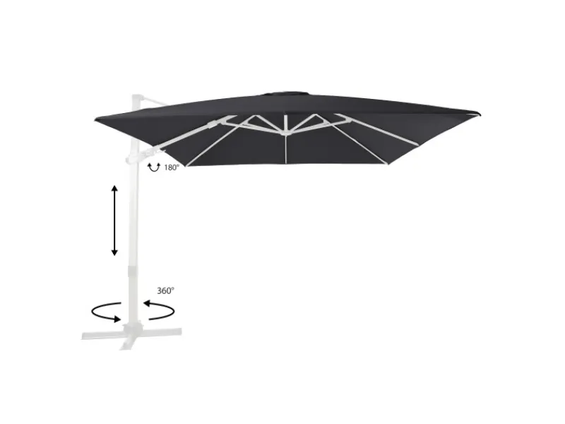 Dank des Handöffners kannst du den Schirm bequem öffnen und schließen. Aufgespannt besitzt er eine Größe von 300 cm in der Breite und 300 cm in der Tiefe. Um den Schirm gezielt für einen optimalen Schattenplatz ausrichten zu können, lässt er sich neigen sowie um 360° drehen. Die maximale Höhe des Sonnenschirms beträgt 255 cm.