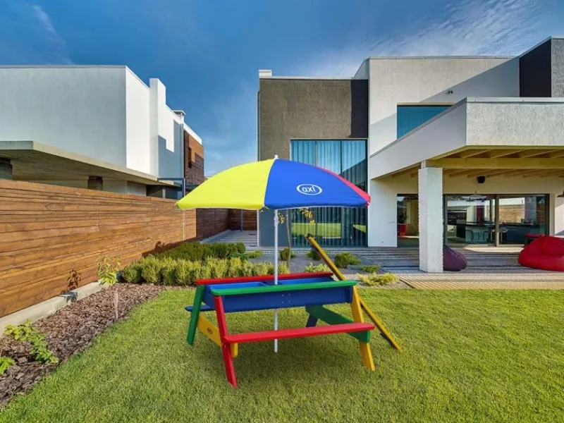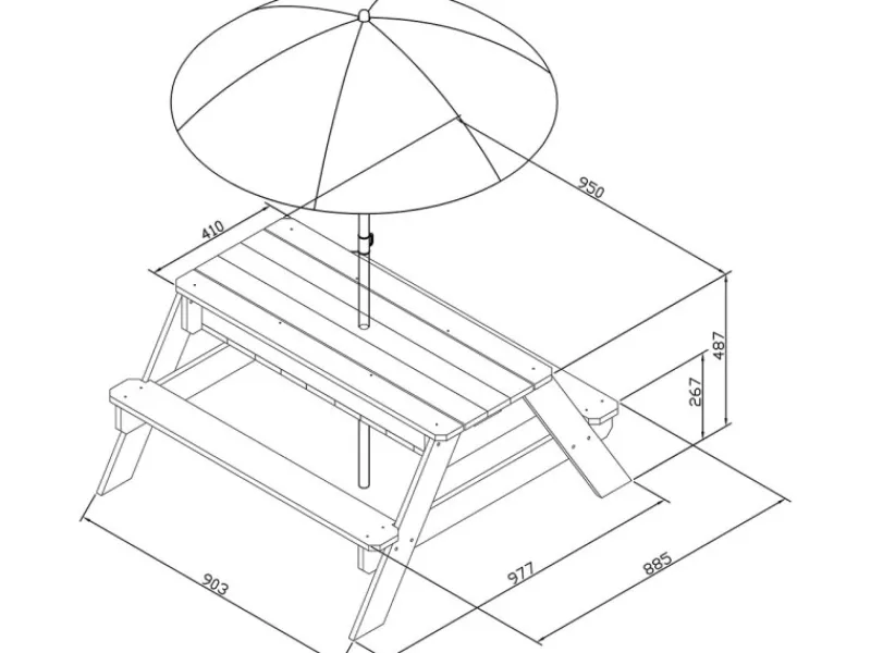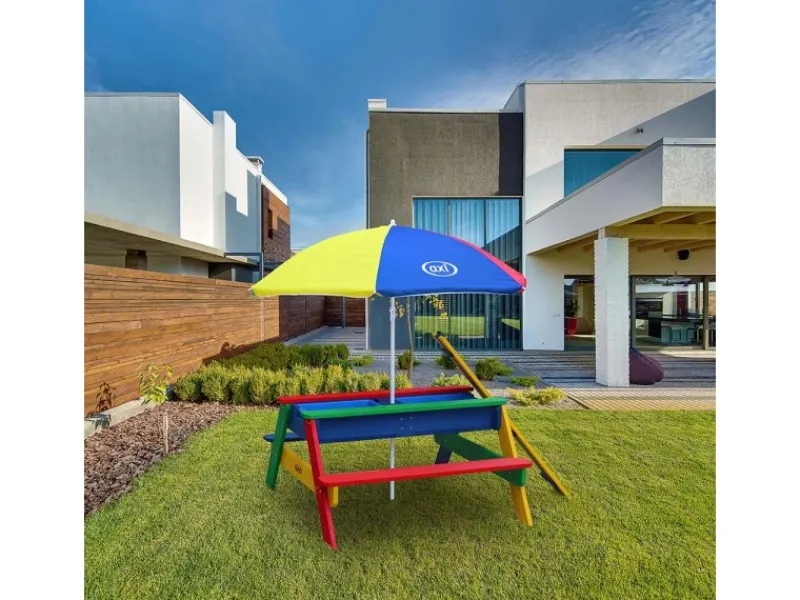 In kürzester Zeit verwandeln Sie den Sand- und Wassertisch in einen Picknicktisch, an dem die Kinder basteln, zeichnen oder ein paar Leckereien genießen können. Der enthaltene Sonnenschirm sorgt dafür, dass sie sicher und kühl im Schatten spielen können.