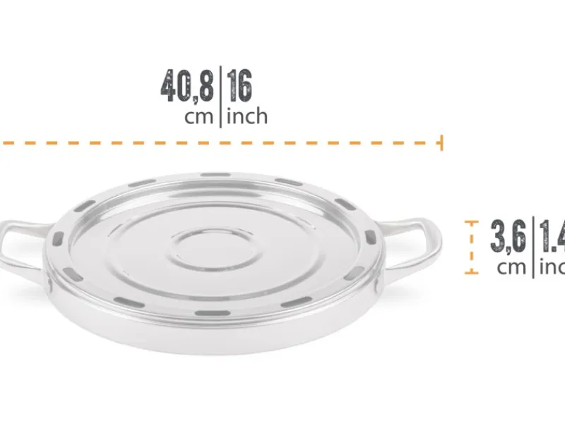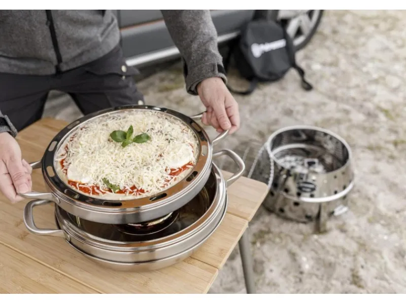 Rundes Pizzablech aus Edelstahl in Kombination mit dem Camping Backofen: zwei Gerichte gleichzeitig kochen