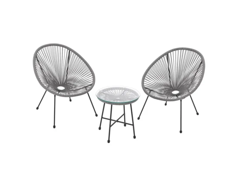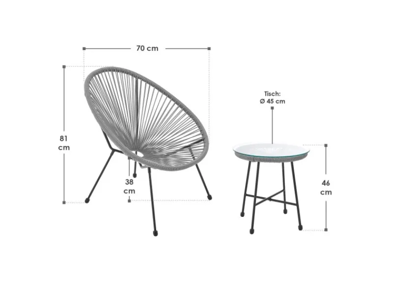 Das Gestell und die Füße bestehen aus pulverbeschichtetem Stahl. Die Balkonstühle tragen jeweils bis zu 100 kg und der Tisch trägt bis zu 30 kg.