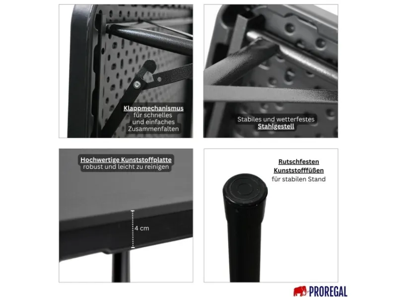 Das Stahlgestell aus robustem Metall sorgt für Stabilität und Langlebigkeit. Dank seiner wetterfesten Beschaffenheit ist der Tisch sowohl für den Innen- als auch Außenbereich bestens geeignet – ideal für Garten, Terrasse, Balkon oder Partyräume. Die Tischplatte aus hochwertigem Kunststoff in stilvollem Schwarz überzeugt durch ihr elegantes Design und ist zudem pflegeleicht und einfach zu reinigen.