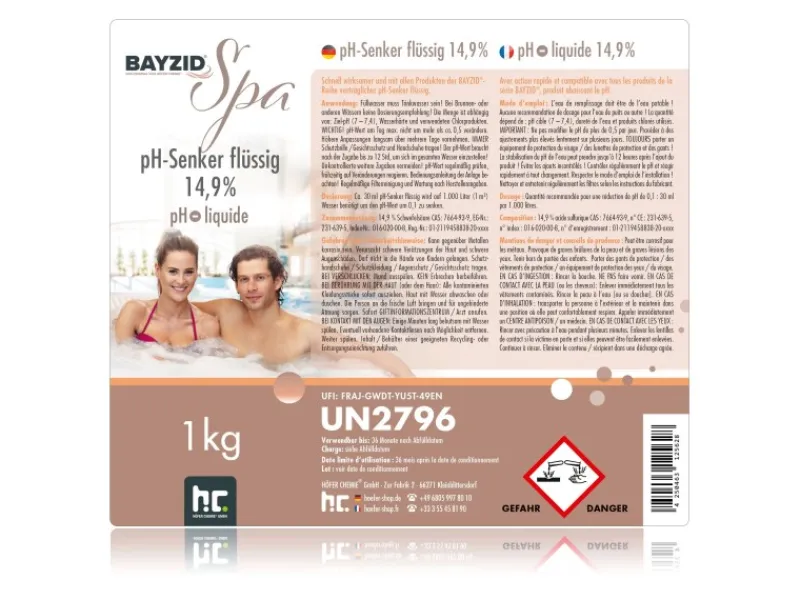 Schnell wirksamer und mit allen Produkten der BAYZID Reihe verträglicher pH Senker flüssig. Dieses flüssige pH Minus ist nicht nur effektiv, sondern auch lagerstabil und besonders rein. Die Flaschen dieses Produkts wurden mit einem Kindersicherheitsverschluss ausgestattet, den Sie durch gleichzeitiges herunterdrücken und drehen öffnen können.