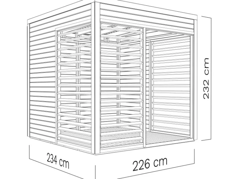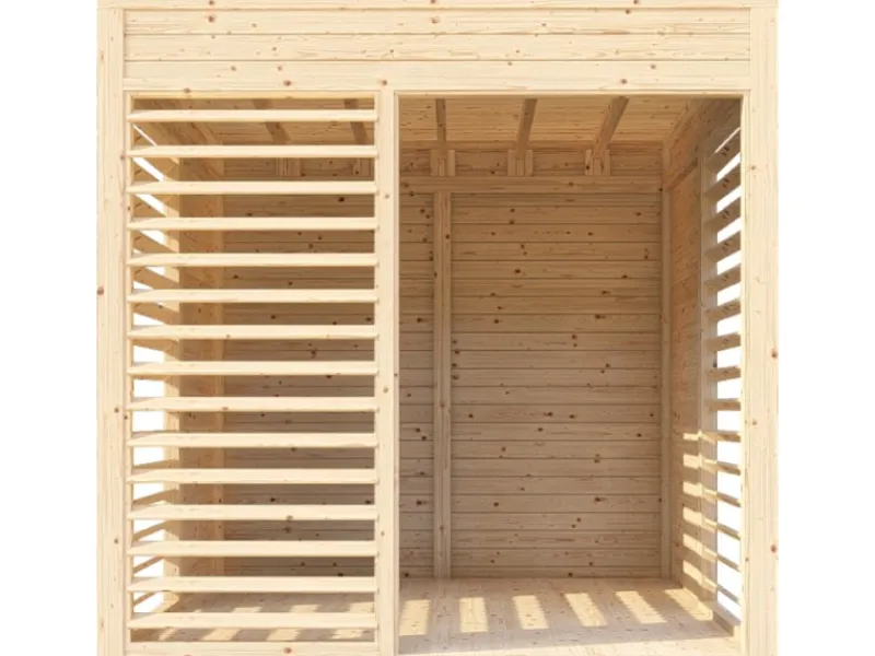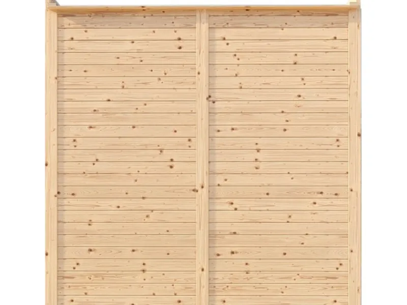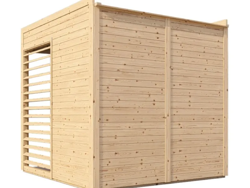 Vollständiger Bausatz inkl. Dach- und Bodenelementen aus Massivholz mit Rahmen sowie sämtlichen Beschlägen und Befestigungsteilen.
