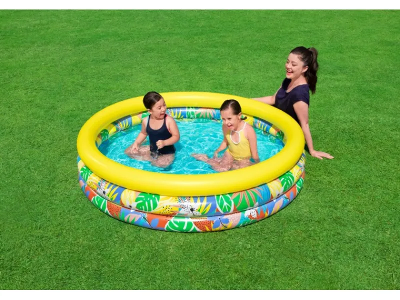 Mithilfe des mitgelieferten Reparaturflickens können kleinere Schäden mühelos und schnell repariert werden. Mit dem Floral Paradise Planschbecken von Bestway kann der Sommer beginnen. Die Größe aufgeblasen beträgt Ø 168 x 38 cm, während die Größe unaufgeblasen Ø 157 cm beträgt.