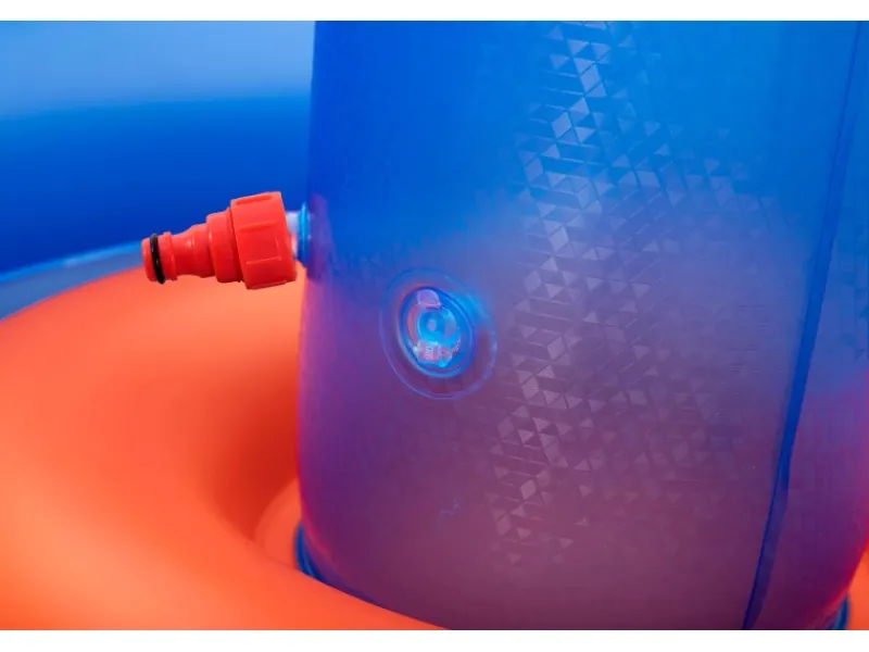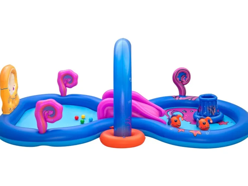 Das Bestway Wasserspielcenter Unterwasserwelt ist mit zahlreichen Features ausgestattet, die für abwechslungsreichen Spielspaß sorgen. Der abnehmbare Bogen mit integriertem Wassersprinkler und Gartenschlauchanschluss bietet eine erfrischende Abkühlung an heißen Sommertagen. Die abnehmbare Wasserrutsche, gesichert durch Seile und Ösen, ermöglicht aufregende Rutschpartien, während die Schleuder in Tentakelform für spannende Herausforderungen sorgt.