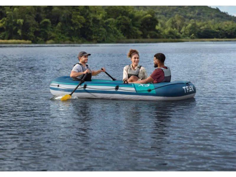 Das Bestway Schlauchboot Set Trek X3 kommt mit allem, was du für ein perfektes Wassererlebnis benötigst. Im Set enthalten sind ein Paar 124 cm lange Ruder, die dir eine kraftvolle und effiziente Fortbewegung ermöglichen. Die Handpumpe Air Hammer sorgt für ein schnelles und einfaches Aufpumpen des Bootes. Solltest du einmal eine kleine Reparatur benötigen, ist ein Reparaturflicken ebenfalls im Lieferumfang enthalten.