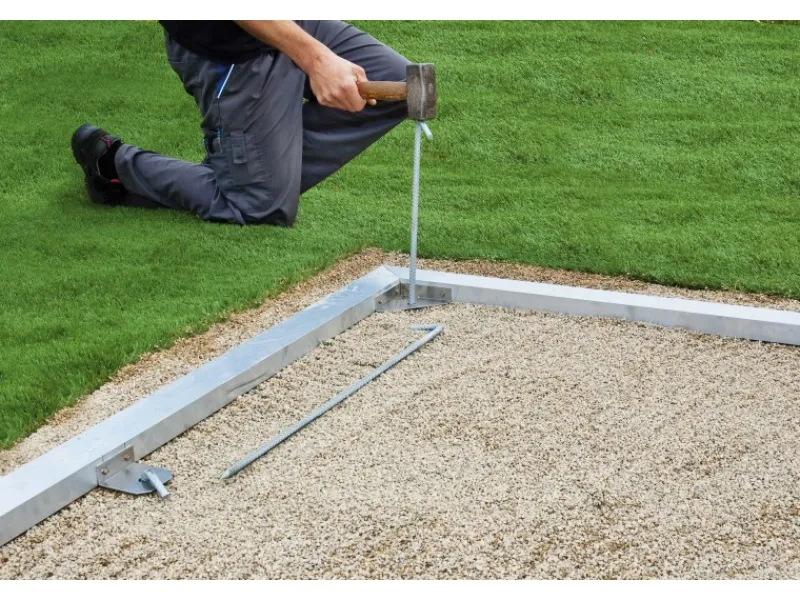 Er verleiht dem Gerätehaus auch ohne Betonfundament die notwendige Stabilität. Wird der Bodenrahmen direkt im Splittbett (ca. 10 cm Splitt, ohne Fundament oder Platten) verlegt, werden zur Befestigung im Erdreich Bodenanker benötigt. Diese sind als Zubehör erhältlich. Anzahl der Anker bitte den technischen Daten entnehmen. Die Sturmsicherheit muss bei dieser Fundamentlösung kundenseitig sichergestellt werden.