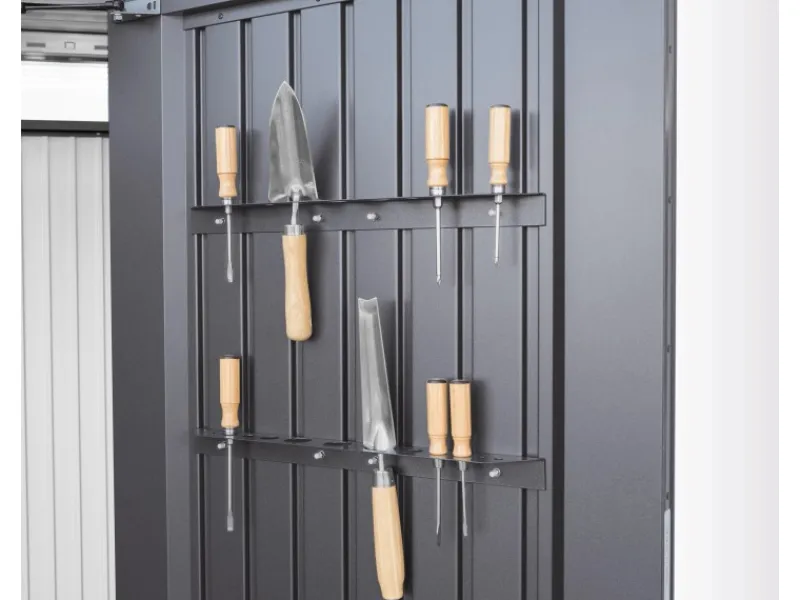 In der komfortablen Grundausstattung sind bereits zwei Regalböden mit entsprechenden Wandschienen enthalten. Hier können Sie beispielsweise Pflanzerde, Töpfe oder kleine Handwerkzeuge ablegen. Vier zusätzliche Gerätehalter dienen zum geordneten Aufhängen von Rechen, Spaten oder Schläuchen. Für die Innenseite der Türen sind zudem zwei Werkzeughalter enthalten.