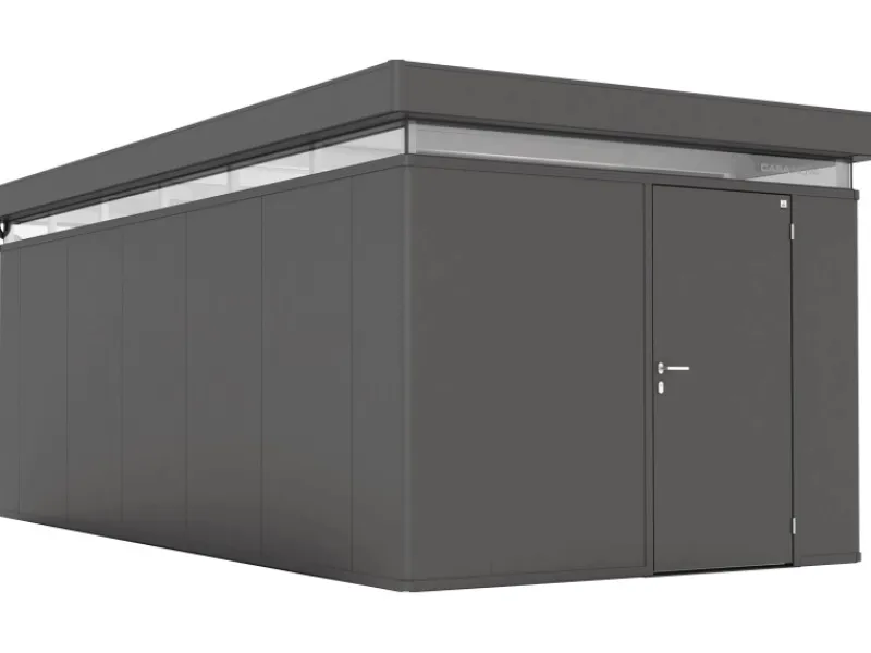 Das Haus verfügt über eine stabile Konstruktion, mit einer Wandstärke von 40 mm. Die maximalen Schneelast des Flachdachs liegt bei 215 kg/m. Die Firsthöhe beträgt 250 cm, wodurch eine angenehme Kopffreiheit im Innenraum gegeben ist. Die Oberfläche des Metall-Gerätehauses ist einbrennlackiert, um es optimal vor Witterungseinflüssen zu schützen und Korrosion vorzubeugen.