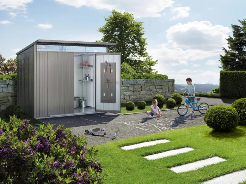 Modernes Gartenhaus mit Doppeltür zur Verstauung von Gartenutensilien und Geräten