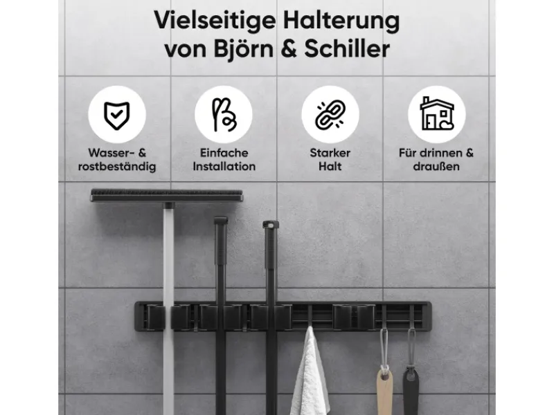 Mit dem Wandhalter von Björn&Schiller bringen Sie Ordnung in Haus und Garten. Die robuste Halterung aus Aluminium bietet Platz für Besen, Wischmopp, Rechen und weitere Geräte. Dank 4 Klemmen und 5 Haken lassen sich Werkzeuge platzsparend und übersichtlich verstauen.