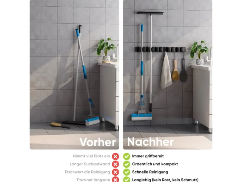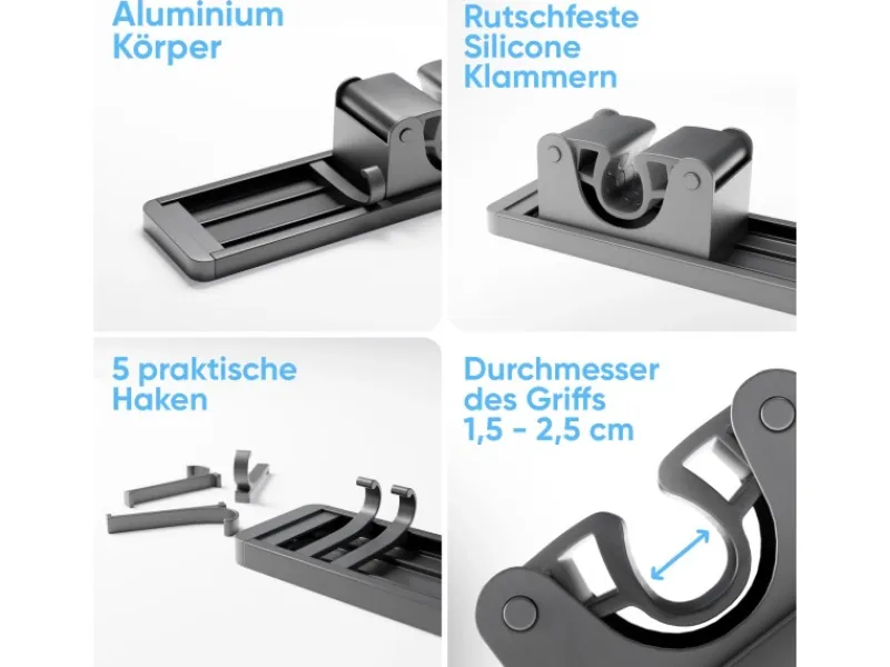Die rutschfesten Klammern aus langlebigem Silikon greifen Stiele fest und verhindern das Herabfallen – auch bei schweren Reinigungsgeräten. Die Tragkraft beträgt bis zu 10 kg.