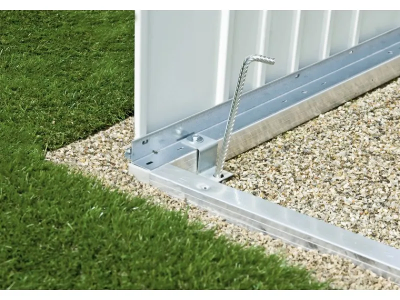 Er verleiht dem Geräteschrank auch ohne Betonfundament die notwendige Stabilität. Wird der Bodenrahmen direkt im Splittbett (ca. 10 cm Splitt, ohne Fundament oder Platten) verlegt, werden zur Befestigung im Erdreich Bodenanker benötigt. Diese sind als Zubehör erhältlich. Anzahl der Anker bitte den technischen Daten entnehmen. Die Sturmsicherheit muss bei dieser Fundamentlösung kundenseitig sichergestellt werden.