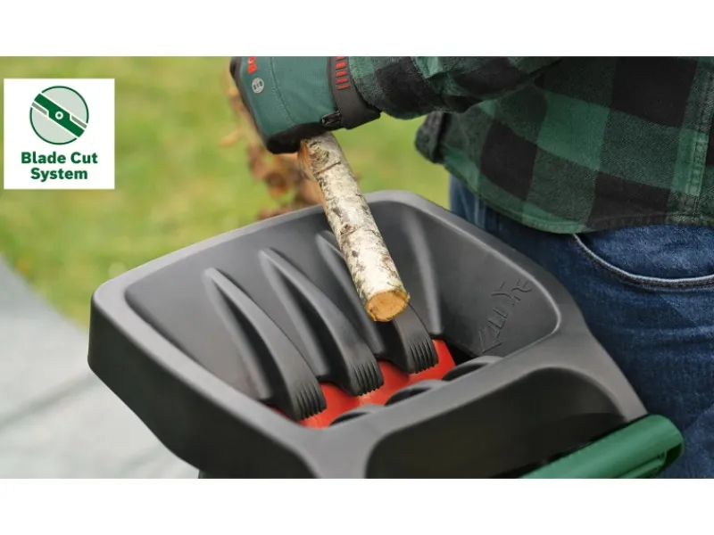 Große Gartenabfälle lassen sich mit dem praktischen Stopfer sicher in den Schnelleinfülltrichter drücken. Dank seines geringen Gewichts ist dieser leistungsstarke Gartenhäcksler leicht über Rasenflächen, Terrassen und Gartenstufen zu transportieren.