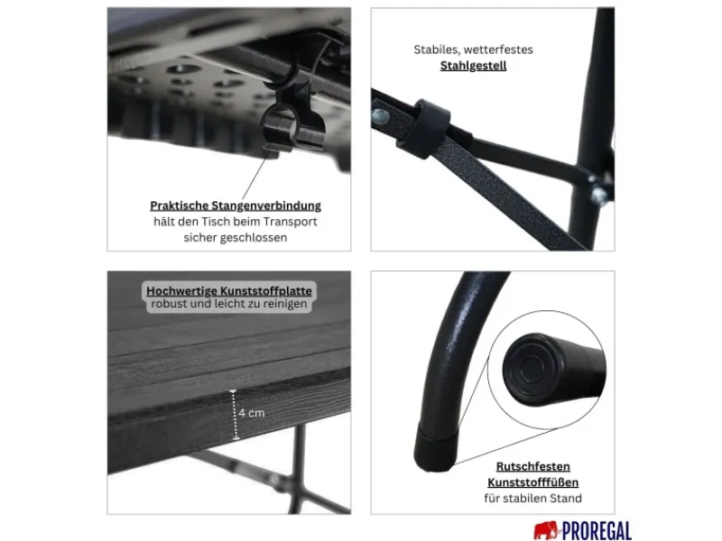 Das Stahlgestell aus robustem Metall sorgt für Stabilität und Langlebigkeit. Dank seiner wetterfesten Beschaffenheit ist der Tisch sowohl für den Innen- als auch Außenbereich bestens geeignet – ideal für Garten, Terrasse, Balkon oder Partyräume. Die Tischplatte aus hochwertigem Kunststoff in stilvoller Holz Optik (Schwarz) überzeugt durch ihr elegantes Design und ist zudem pflegeleicht und einfach zu reinigen.