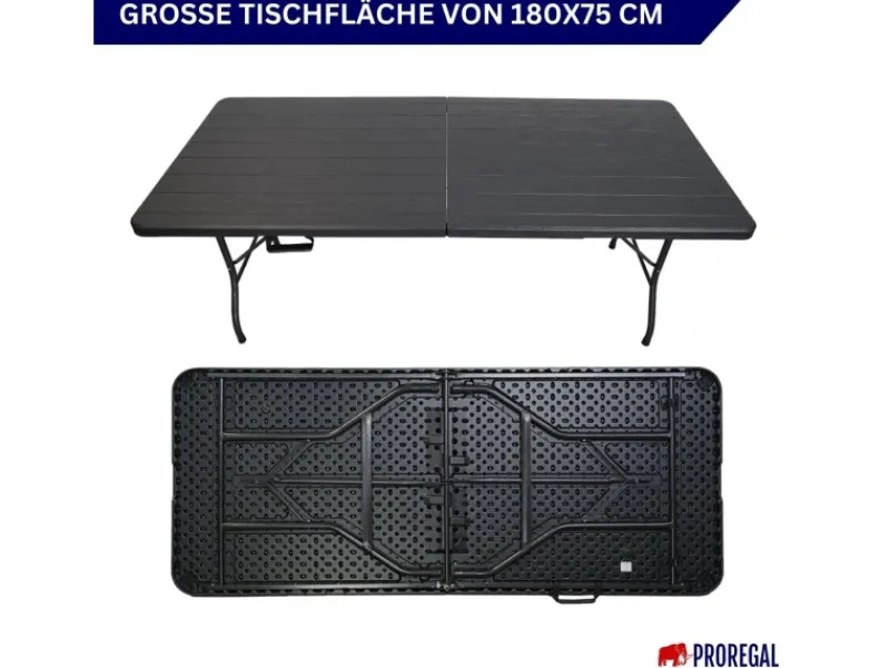 Die große Tischplatte (180 x 74 cm) bietet bequem Platz für Speisen, Getränke oder Dekoration und eignet sich für bis zu 8 Personen. Mit einer Tischhöhe von 74 cm bietet der Tisch eine angenehme Arbeitshöhe für alle Anlässe. Ob als Partytisch, Campingtisch oder Gartentisch, dieser Allrounder ist überall einsatzbereit.