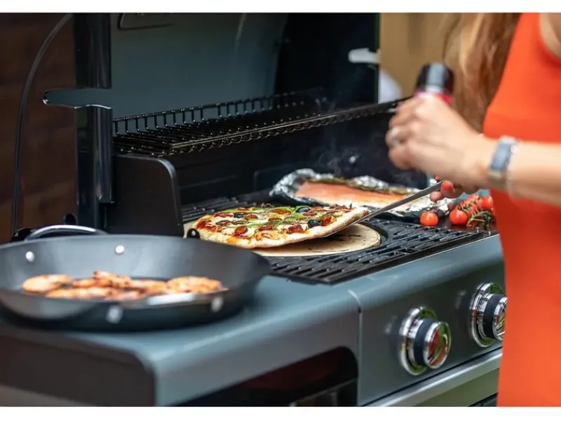 Für eine knusprig gebackene Pizza einfach den Pizzateig auf der Edelstahlplatte ausrollen und zusammen mit dem Pizzastein aus Keramik in den vorgesehenen Ring des Grillrostes einsetzen. Für ein perfektes Ergebnis Deckel schließen.