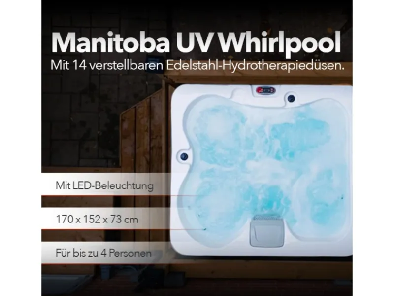 Der Canadian Spa Manitoba UV Plug & Play Whirlpool passt an fast jeden Ort. Der kompakte und dennoch geräumige Whirlpool ist mit Funktionen eines normal großen Whirlpools ausgestattet und bietet problemlos Platz für 4 Personen. Er verfügt über 15 verstellbare Edelstahl-Hydrotherapiedüsen und LED-Beleuchtung in verschiedenen Farben. Die mehrfarbige LED-Beleuchtung bietet Ihnen die perfekte Möglichkeit, sich nach einem langen Tag wirklich zu entspannen. Der Whirlpool ist einfach zu installieren und muss einfach nur an eine Steckdose angeschlossen werden. Der Whirlpool wird mit einer harten Isolierabdeckung und einem Filter geliefert.