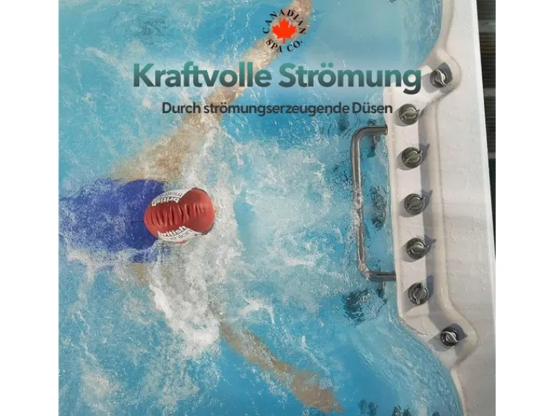 Eine Vielfalt an austauschbaren Massagedüsen mit verschiedenen Massageformen stehen zur Verfügung. Sie sind zur individuellen Druckeinstellung leicht greifbar und artritisfreundlich. Die strömungserzeugende Düsen liefern einen starken, kontinuierlichen Wasserstrahl, der gerades und ebenes Schwimmen unterstützt. Insgesamt 3 Pumpen fördern bis zu insgesamt 3360 Liter pro Minute vor der Lufteinblasung. 6 Luftventile, die eine individuell einstellbare Lufteinblasung in das Wasser ermöglichen, bieten einen erhöhten Durchfluss. Zudem verfügt er über verschiedene Steuerungsmöglichkeiten womit der Strom nach den persönlichen Wünschen konfiguriert werden kann.