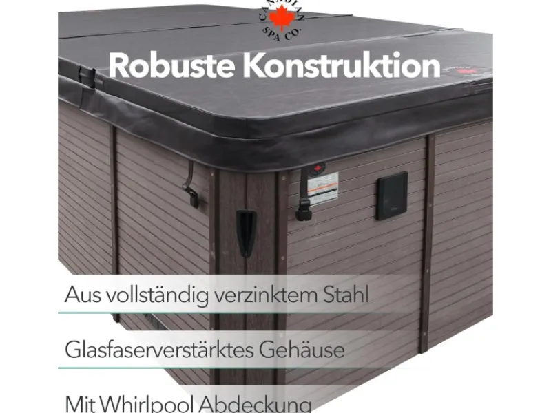 Das Spa besteht aus vollständigen Tragrahmen aus verzinktem Stahl, der das Gewicht gleichmäßig auf die Basis des Spa verteilt. Die Marine-Grade-Holzbasis schützt zusätzlich vor Fäulnis und Schädlingsbefall. Der Whirlpool verfügt über einen wartungsfreien PVC-Holzeffektschrank und Glasfaserverstärktem Gehäuse.