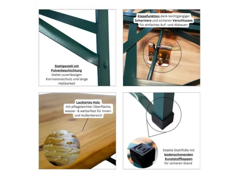 Dank der klappbaren Konstruktion lassen sich Tisch und Bänke schnell auf- und abbauen. Die leichtgängigen Scharniere ermöglichen eine einfache Handhabung, während die stabilen Verschlüsse für Sicherheit beim Transport und im Gebrauch sorgen. Im zusammengeklappten Zustand benötigt das Set nur wenig Stauraum (ca. 5 x 170 x 46 cm) und ist somit besonders platzsparend zu verstauen.