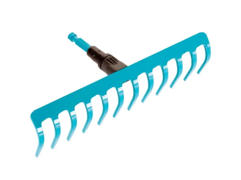 Der Rechen hat eine Arbeitsbreite von 30 cm (mit 12 Zinken) und passt zu allen Gardena-combisystem-Stielen, wobei Gardena eine Stiellänge von 150 cm empfiehlt, abhängig von der Körpergröße.