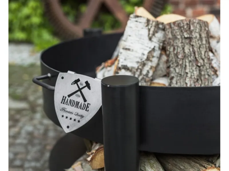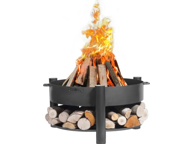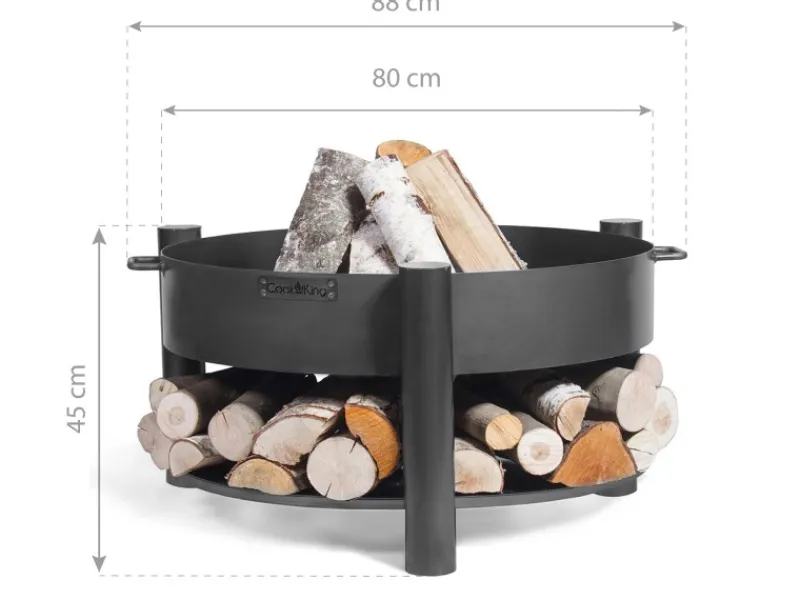 Die Feuerschale verfügt über ein minimalistisches Design und wird von drei stabilen Beinen getragen, die für eine kippsichere Standfestigkeit sorgen. Ein besonderes Merkmal dieser Feuerschale ist das integrierte Regal für Holz unterhalb der Feuerstelle, das das Holz griffbereit lagert und gleichzeitig durch die Wärme der Feuerschale trocknet.