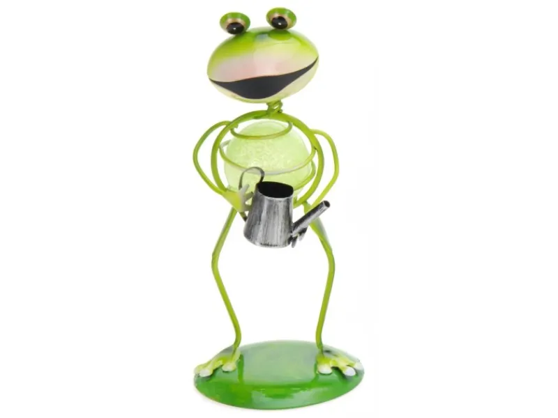 Der Deko-Frosch aus Metall ist ein toller Blickfang auf dem Balkon oder auf jeder Terrasse. Er macht sich auch gut zwischen Blumen und Sträuchern. Die Figur ist aus lackiertem Metallblech gefertigt und eignet sich hervorragend für den Außenbereich. Die Froschkörpermitte besteht aus einem „Glow in the dark“-Leuchtstein.