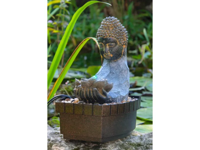 Das Wasser sprudelt aus der Blüte, in deren Inneren LEDs für herrliche Lichteffekte sorgen. Die Abdeckung der Kunststoff-Unterschale kann mit den mitgelieferten Kieselsteinen ausgelegt werden. So erzeugen Sie ein entspannendes Wohlfühlambiente, das Sie den Stress im Alltag vergessen lässt. Der Springbrunnen ist ca. 20,5 cm x 16,5 cm x 27 cm groß und hat einen Energieverbrauch von 2 W. Neben dem Brunnen sind 200 g Ziersteine, ein ca. 1,6 m langes Netzkabel inkl. Pumpe und eine ausführliche Bedienungsanleitung im Lieferumfang enthalten.
