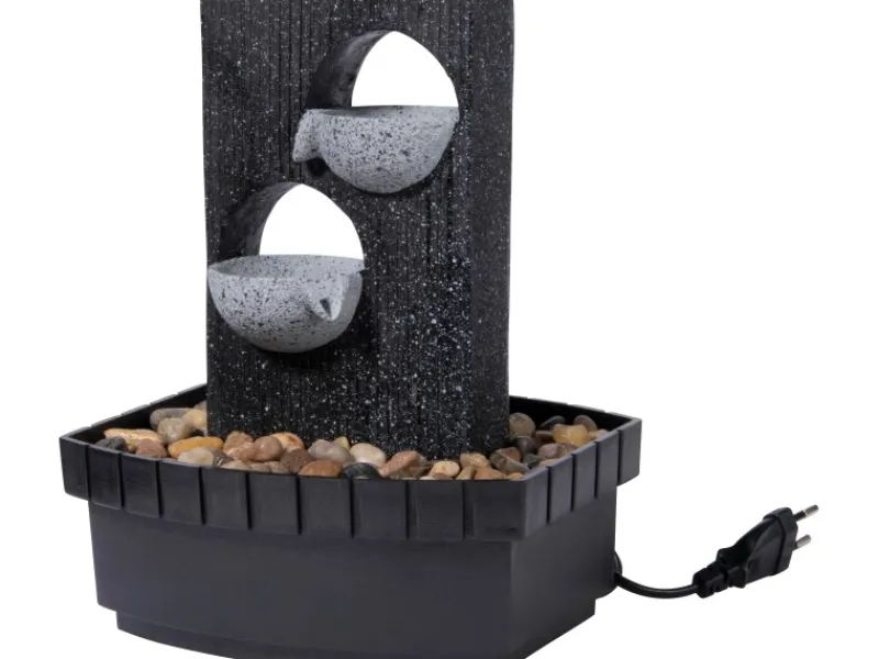 Der Springbrunnen ist ca. 20,5 cm x 16,5 cm x 26 cm groß und hat einen Energieverbrauch von 3,5 W. Neben dem Brunnen sind 200 g Ziersteine, ein ca. 1,6 m langes Netzkabel inkl. Pumpe und eine ausführliche Bedienungsanleitung im Lieferumfang enthalten.