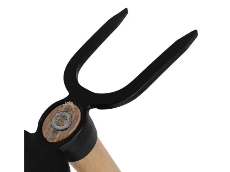 Durch den langen Holzgriff lässt sich die Doppelhacke leicht greifen. Mit dem Loch am Griff kann die Hacke außerdem leicht verstaut werden.