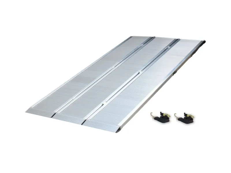 Natürlich können auch Quads, Kleinfahrzeuge und Rasentraktoren mit Hilfe der Rampe verladen werden.Eigenschaften:sehr stabile Ausführung – massives Aluminiumhochwertige Verarbeitung an den Alu-Schweißnähtensehr breite Lauffläche mit geriffeltem Profil für einen sicheren Halt3 fach klappbar dank zweier Gelenke für platzsparenden Transport / Aufbewahrungdie 3 Elemente sind mit Scharnieren zusammengenietetTragkraft bis 1650 kg / Rampe bei gleichmäßiger Verteilung der Last und einem Achsabstand von >80 cm | 550 kg je Element (Luftbereifung aus Gummi)Maße: 175 x 114 x 4 cm (LxBxH) – Auffahrlänge: 167 cmzusammengeklappt nur 37 cm breit und 14 cm hochmin. Ladehöhe: 30 cm bei 17% Steigungmax. Ladehöhe: 53 cm bei 30% SteigungLaufflächenbreite: 113,6 cmGewicht: 32,0 kg (pro Rampe)Spanngurt mit Haken und Klemme 153 x 2,5 cm zur Sicherung an Anhänger und Transporter